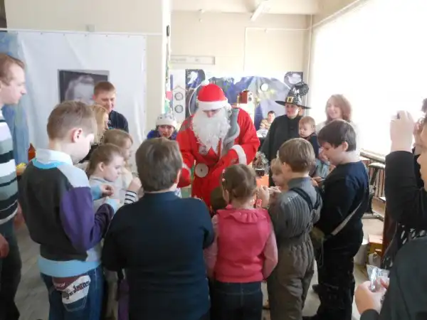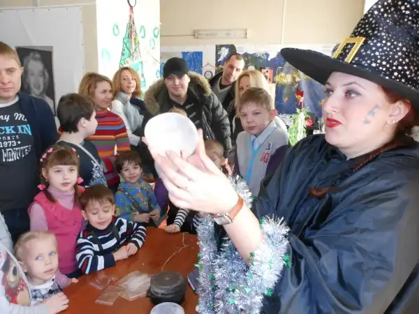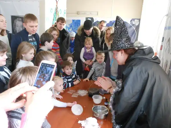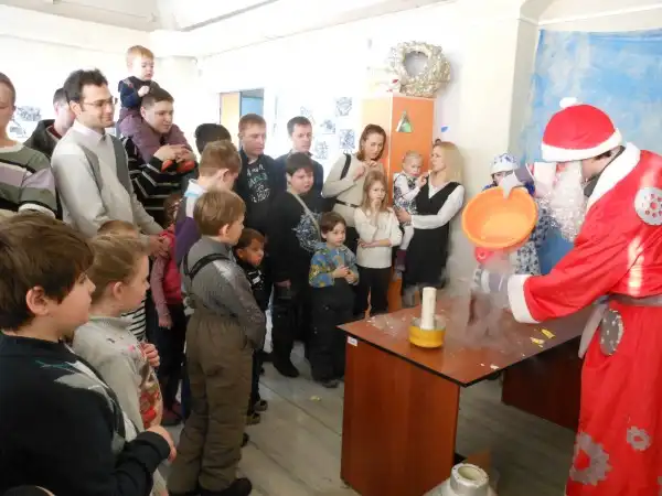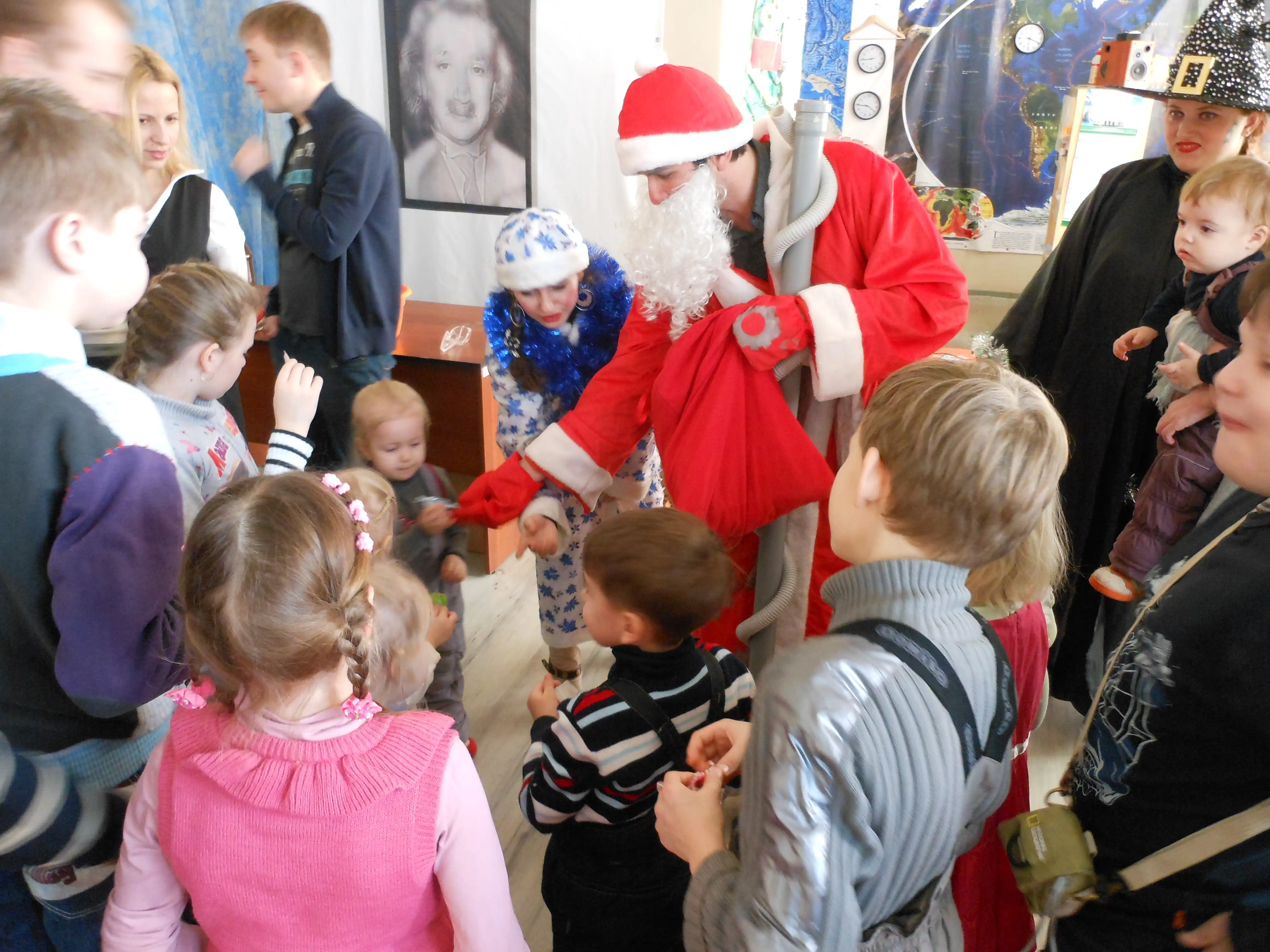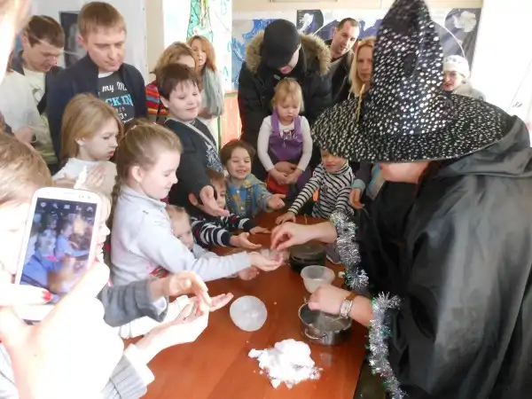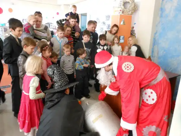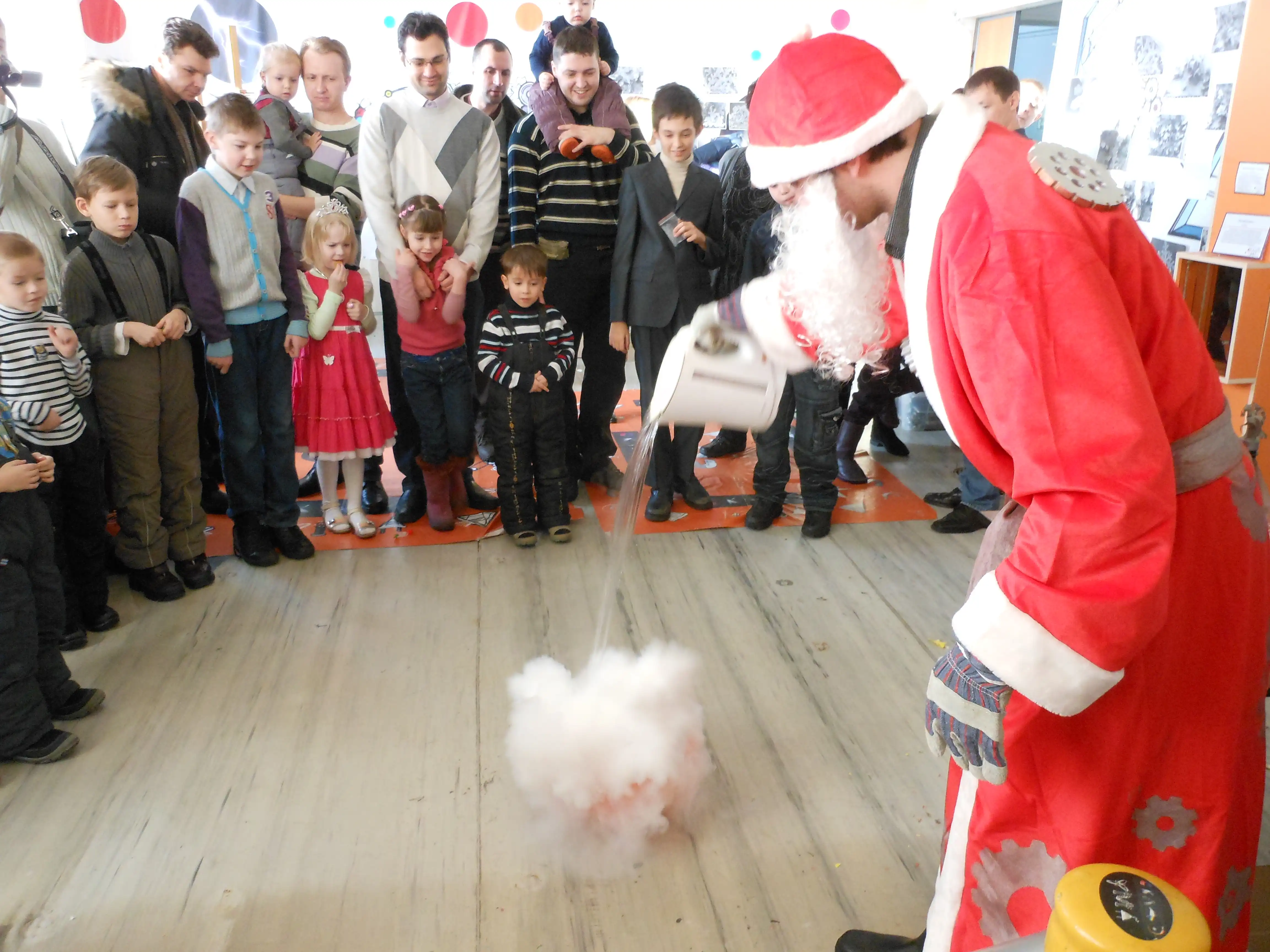 Дальше - шоу с жидким азотом. Дед Мороз пытался очень аккуратно его наливать и работать с ним, а дети кричали: "Ну Дед Мороз же не боится холода! Лей смело!"