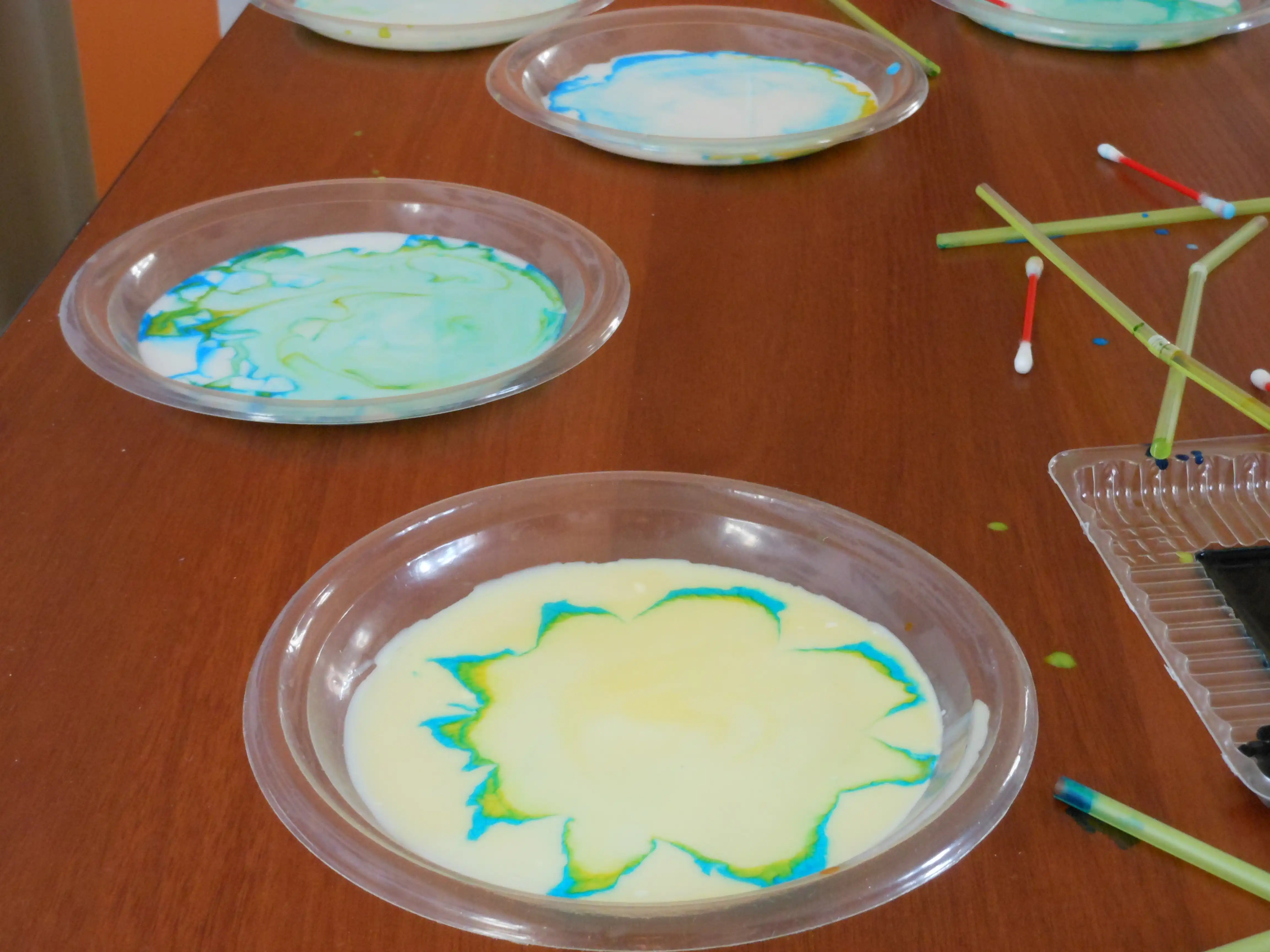 Дальше рисовали узоры на молоке. Опять же хороший способ развлечь ребенка: в миску налили молока, и каплями добавляли краску от цветного принтера или тушь - получаются очень красивые разные узоры (акварель или гуашь "не работают"). Но самое интересное, если взять ватную палочку и окунуть ее в жидкое мыло, а потом в краску, узоры начинают "жить": разлетаются по молоку, меняются быстро и очень красиво...
