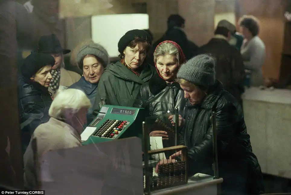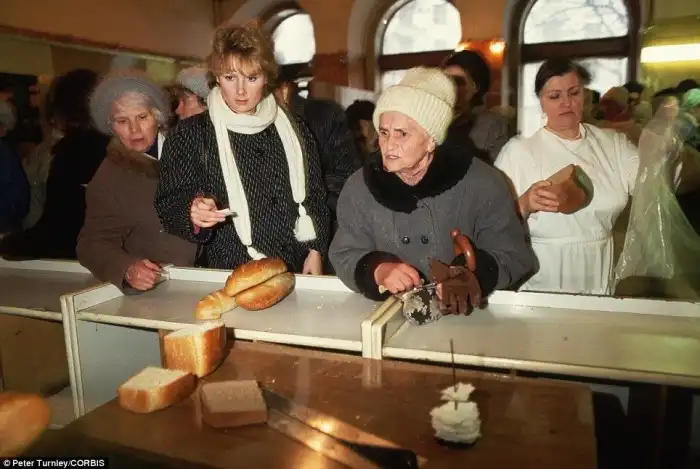 Эти шокирующие фотографии будто сделаны во времена Великой Депрессии – но на самом деле они показывают жизнь в последние годы существования Советского Союза, менее трех десятилетий назад. Полки магазинов нередко пусты, в порядке вещей было выстаивать длинные очереди, чтобы купить продукты, и многие люди кажутся измученными вековой бедностью.