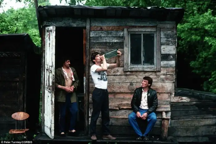 Сибиряки "расслабляются" у сарая в городе Новокузнецк, который в начале 90-х одолевали серьезные экономические проблемы.