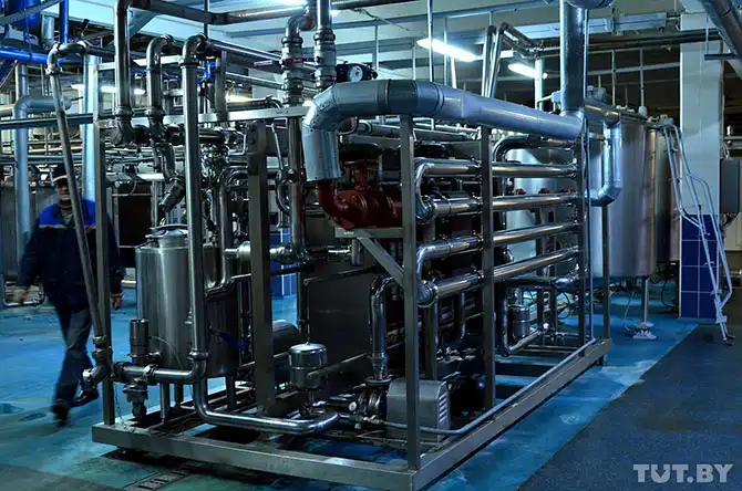 Резервуары для хранения вновь поступившего сырья находятся также недалеко от зоны приемки, только чуть ниже, и, конечно же, молоко в них поступает только после охлаждения. Интерьер хранилища чем-то напоминает подводную лодку: такое же множество труб (правда, исключительно из сияющей пищевой нержавейки) и круглые герметичные люки.