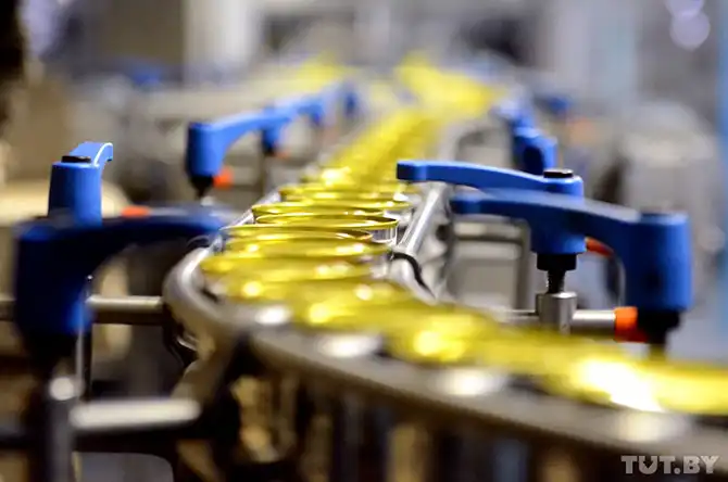 Далее заполненные, но пока еще «безымянные» баночки со сгущенкой направляются на конвейер, который доставляет их прямиком к машине для наклеивания этикеток. Как и все процессы на Глубокском МКК, этот полностью автоматизирован: умное оборудование само и наклеит этикетку, и обожмет ее, и прокрутит банку во время данного процесса.