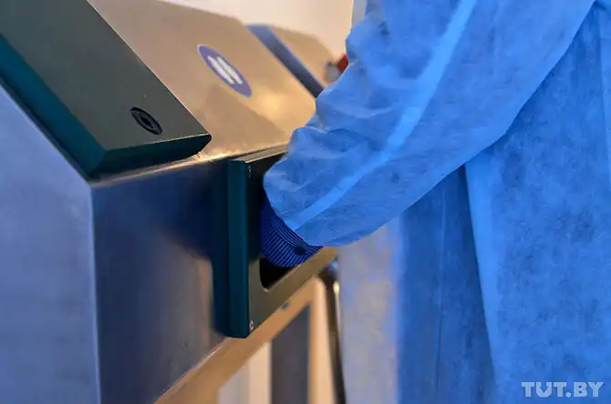 Но и это еще не все! При входе в цех необходимо поместить обе руки в специальный автомат-турникет, который нальет на ладони немного дезинфицирующего средства для их протирки. Одновременно с этим подошвы обуви обрабатываются специальным дезраствором. Лишь после срабатывания аппарата на проходной загорится зеленый свет, а турникет позволит пройти внутрь.