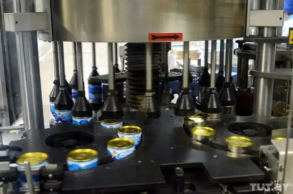 Тем временем из соседнего цеха поступают жестяные банки (пока еще пустые) и крышки к ним. Специальная машина с точностью до грамма заполняет банки сгущенным молоком, после чего тара сразу же закатывается. Заполненные жестянки вылетают из машины почти как из пулемета со скоростью 300 банок в минуту! По заверениям сотрудников МКК, современная линия производства итальянской фирмы Zilli & Bellini способна выдавать и по 450 банок сгущенки в минуту, просто такая скорость на данный момент не используется.
