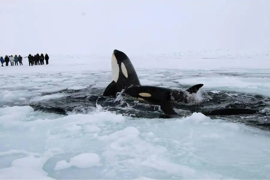 Представители Министерства рыболовства и океанов Канады сообщили, что в четверг отправили команду для оценки ситуации. Охотники впервые наткнулись на косаток во вторник, спустя день после того, как местные жители сказали, что залив покрылся льдом. Жители посёлка не удержались, чтобы не совершить часовую поездку и не посмотреть на косаток. Представитель службы безопасности Инукджуака сообщил CTV, что в январе киты не должны находиться в этой местности. «Кажется, что они паникуют», - сказал мэр Инукджуака Питер Инукпук. «В другие времена они уходили на долгое время, вероятно, ища другое открытое пространство». «Мы видели таких китов только летом, и никогда - зимой», - добавил он. Несколько жителей посёлка сказали, что отверстие, кажется, становится меньше, так как увеличивается ледяной покров. Инукпук попросил прислать ледокол, чтобы освободить китов, однако в Министерстве рыболовства и океанов Канады ответили, что все еще оценивают ситуацию и рассматривают каждый возможный вариант. Впрочем, вскоре в заливе изменились водные течения. За счёт этого лопнул лёд и открылась протока в 35 км. Косатки покинули свою "клетку".