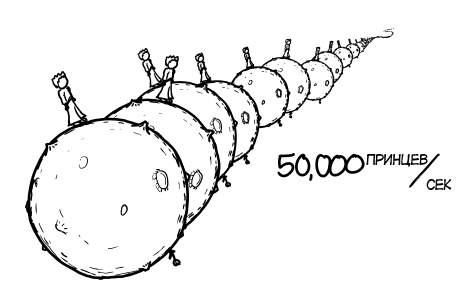 К сожалению, устойчивый метеоритный дождь с больших высот принесёт в атмосферу столько же энергии, сколько дали бы ежедневные колоссальные удары, и итоговая дань смерти будет та же самая. Семь миллиардов человек плюс четыре миллиона Маленьких принцев в день.