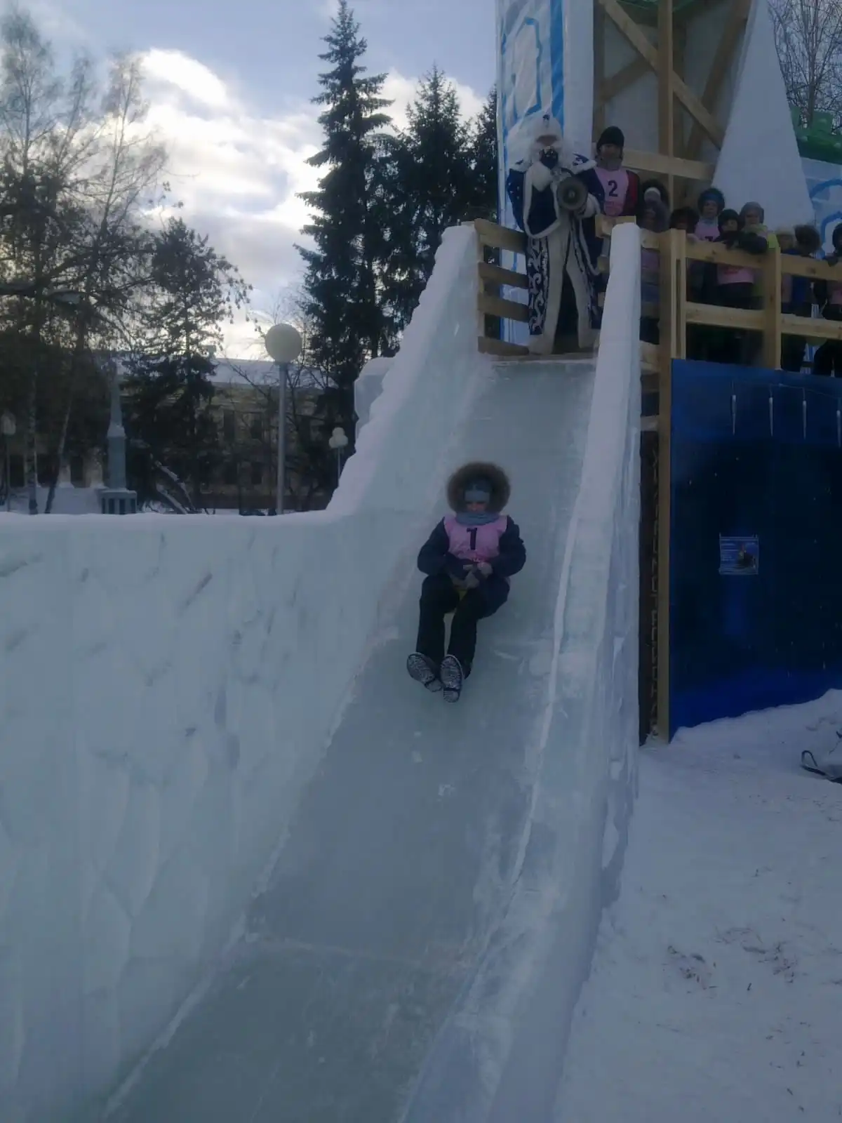 Скорость спуска замеряли при помощи секундомера. Схема проста – по команде Деда Мороза участник съезжал с горки. Внизу его уже ждал результат.