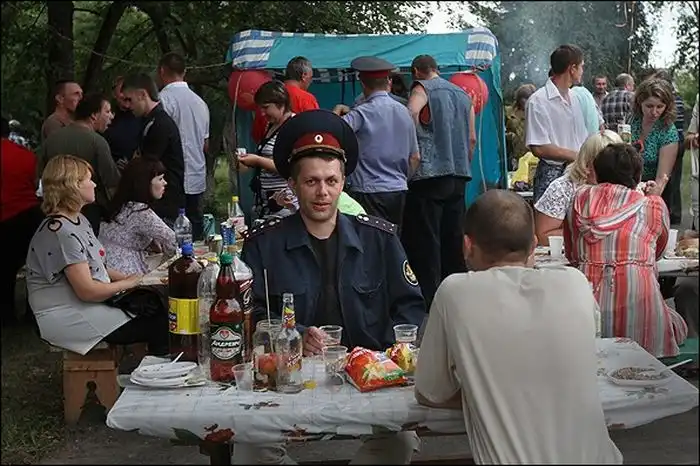 Без рюмки водки не обходятся свадьбы и похороны, отъезды и приезды, приемы и проводы гостей. Причем спиртное в ходу не только на бытовом, низовом уровне, но и на официальном. Водка скрепляет устные договоры и государственные обязательства районного масштаба. И если в будние дни пьянство разрешено, но не поощряется, то в праздники народу позволительно быть "счастливым" 24 часа сутки, наотмашь, до упаду. Вот так выглядит "русское счастье".