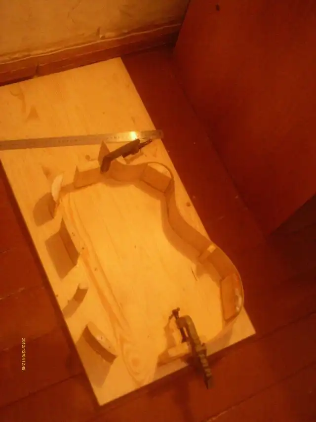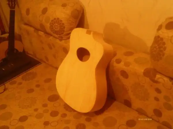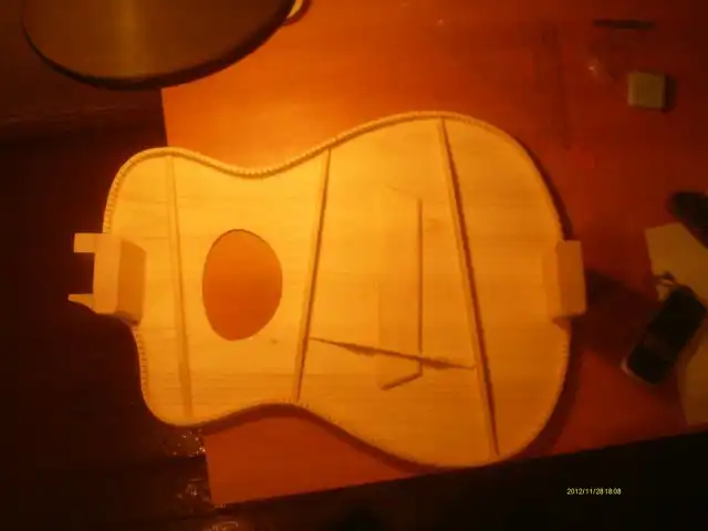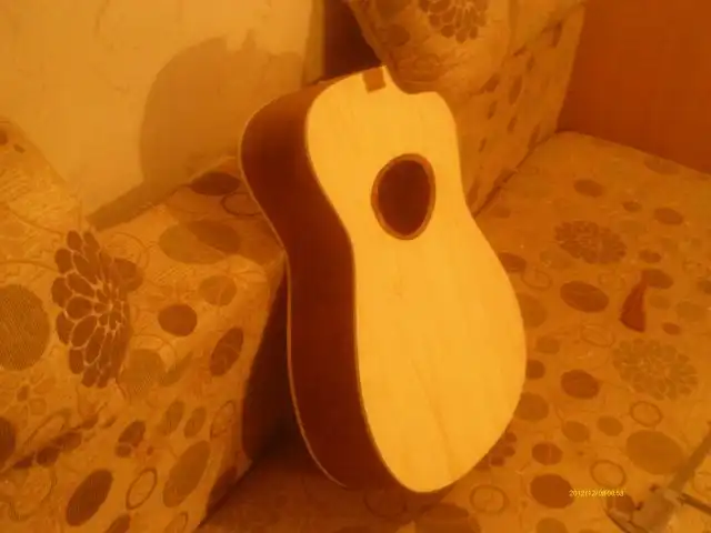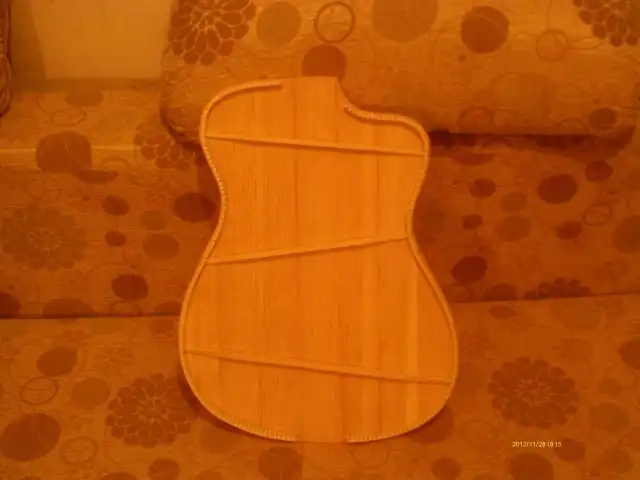 Склеил стык, заготовки дек, выпилил форму гитары. Наклеил пружины, контр-обечайки, и накладку усиливающую конструкцию гитары: