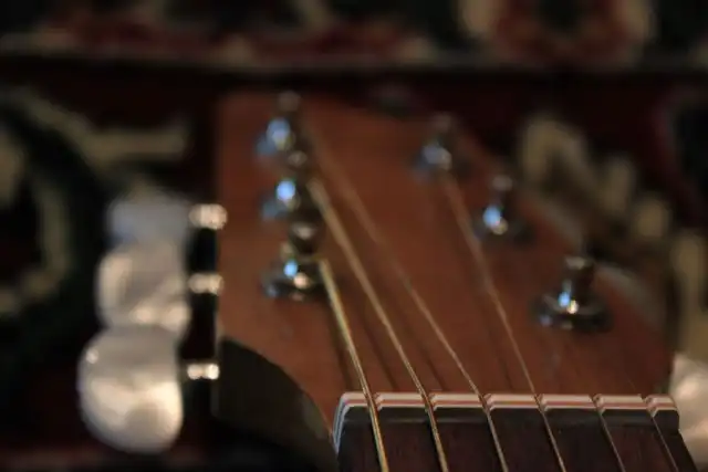 Покрасил бока и заднюю деку в цвет "орех". Оформил розетку резонатора, и наклеил белую кайму по граням гитары: