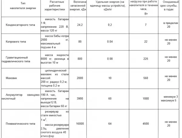 Приведем параметры рассмотренных типов накопителей энергии в сводной таблице: