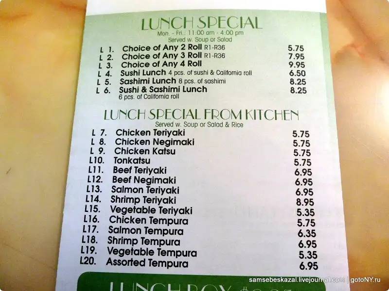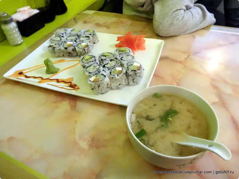 Автор: Были мы всей семьей. Я взял то, что в России именуется бизнес-ланчем, а здесь просто ланч-спешал. За $7.95 предлагали три вида суши на выбор, плюс суп мисо или салат. Рыбу я почему-то не люблю, и суши единственный вариант рыбного блюда который я ем.