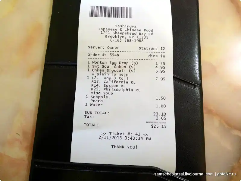 Ну и самое интересное - чек. Еда на троих нам обошлась в $25.15, и мы не смогли все доесть и принесли часть домой. Дешевле только Макдональдс или другой фаст-фуд. То есть при поездке вдвоем-втроем вы можете закладывать, что на еду у вас уйдет не меньше 25-30 долларов за прием, если что-то более-менее приличное. Пиццу можно и за доллар купить, но это, на мой взгляд, не еда. За обслуживание в Нью-Йорке принято оставлять 18% чаевых. Их считают просто - умножают налоги в чеке на два. Оставлять принято, но не обязательно. Туристы из Европы этого не делают. Местные же знают, что чаевые важная часть системы и основной источник дохода официанта, поэтому платят их исправно. Чаевые не надо платить если берете еду на вынос.