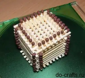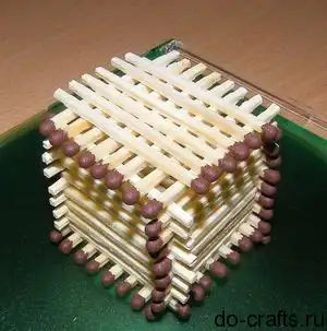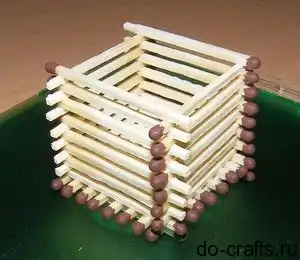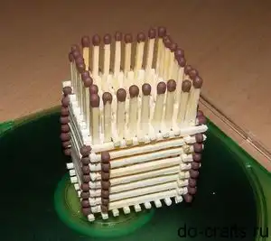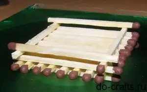 2-й шаг: наверх, не забывая использовать свой глазомер, кладем еще 8 спичек. При этом расстояние между спичками не должно превышать толщину самой спички. Перпендикулярно предыдущему слою улаживаем еще один слой из 8 спичек. Затем по краям основы выкладываем 4 спички и проделываем эту процедуру 6 раз.