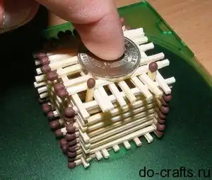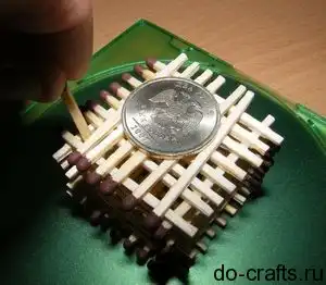 3-й шаг: два настила (первый – из 8 спичек, второй – из 6 спичек) завершат наш каркас. Каркас прижимается монетой. Как сделать замок из спичек, чтобы он не развалился и был более прочным? Для этого Вам понадобится по всем четырем углам поставить спички. И затем повторить такое же действие по всему периметру спичечного замка.