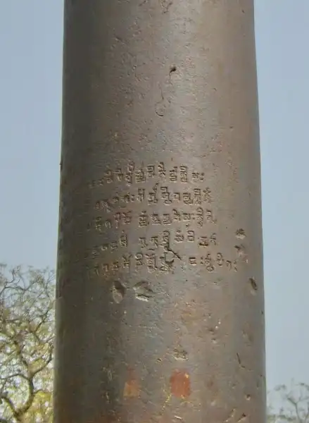 Колонна сделана из чистого железа, но практически не подвержена коррозии. Исследователи полагают, что дело в специфических климатических условиях Дели, благодаря которым на поверхности монумента образовалась особая пленка, защищающая его от разрушения. Опоясывающая колонну надпись на санскрите гласит, что она была поставлена в честь победы царя Чандрагупты над народами Средней Азии.