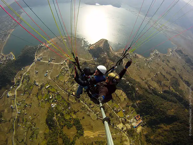 55. Одно из популярных развлечений в Покхаре – полёт с парапланом над озером Фева, среди Гималайских гор