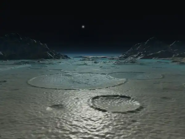 Полный Нептун в небе – единственный источник света для ночной стороны Тритона. Тонкая линия поперек диска Нептуна – это его кольца, видимые с ребра, а темный кружок – тень самого Тритона. Противоположный край депрессии на среднем плане находится примерно в 15 километрах.