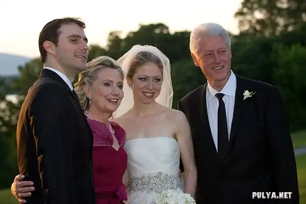 Свадьба единственной дочери бывшего президента США проходила под грифом строгой секретности. Челси Клинтон и банкир Марк Мезвински сочетались браком в городе Райнбеке, штат Нью-Йорк. Чтобы папарацци не смогли проникнуть на церемонию и вечеринку, ведущие к городу дороги были закрыты, как и воздушное пространство над ним, а гостям выдавались специальные идентификационные браслеты. Как настоящая американская невеста, Челси предпочла платье от дизайнера Веры Вонг — давней приятельницы семьи Клинтон. Над изысканным угощением трудились три крупные кейтеринг-компании, услуги которых обошлись в общей сложности в $750 000. Клятвы верности будущие супруги приносили одновременно перед пастором и раввином, так как Челси — методистка, а Марк — иудей.