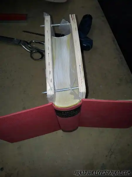 Шаг1. Вырезаем из фанеры 2 платки по размеру больше страницы у книги на 3-4 сантиметра по трём сторонам. Кладем на одну из плат плёнку или пакет, затем кладем книгу на пленку последней страницей согнув титульные страницы ( можно как я оставить первых несколько страниц), опять накрываем пакетом и сверху кладем вторую фанерку.Смотрим чтоб страницы легли ровно и небыли замяты и скручиваем этот "сэндвич" шурупами. Пакеты нужны чтоб в последствии всю эту конструкцию можно было легко разобрать . Далее берем губку и клей , и наносим тонкий слой на торцы листов. Сильно много не нужно наносить во избежании потеков. Оставляем сохнуть. У меня полный процесс сушки занял около 2 часов.