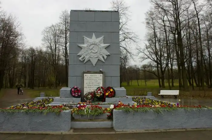 Первое, что мы встретим по дороге справа - Памятник защитникам Ленинграда, установленный в 1944 году. Возможно, это самый первый памятник, посвященный ВОВ. «Здесь в жестоких сентябрьских боях 1941 года доблестные защитники Ленинграда, не щадя своей жизни, остановили фашистские полчища».
