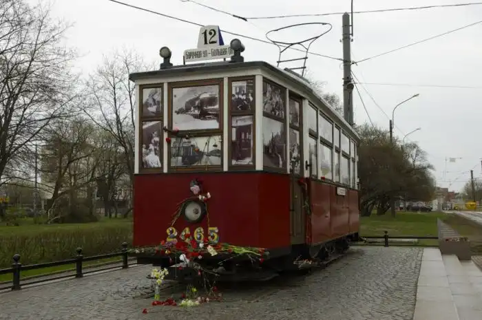 В сентябре 1941 года фашисты вышли на эти трамвайные рельсы в районе Петергофского шоссе, мирные жители еще не знали об их прорыве. Вагоновожатый стрельнинского трамвая повел его на группу шедших навстречу фашистов, в ответ на что они открыли огонь и расстреляли всех пассажиров, искорежив вагон. Есть другая версия этой истории - фашисты на трамвайной остановке попросили пассажиров выйти и захватили уже пустой вагон. Хочется верить во вторую версию, но война редко бывает так милосердна.