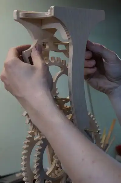 Затем крепится шестерня спускового механизма. Вместе с анкером они преобразуют вращательное движение главного колеса в «шагающее», отсчитывая секунды.