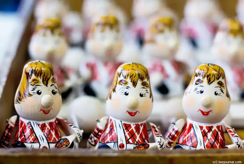 Работают гуашью, а после покрывают безвредным масляным лаком. Раньше на фабрике дела шли отлично и работало несколько сотен человек. Теперь рабочих становится всё меньше и меньше, некоторые цеха даже пустуют. Говорят, что за 12 лет коллектив уменьшился в 2 раза и сильно постарел.