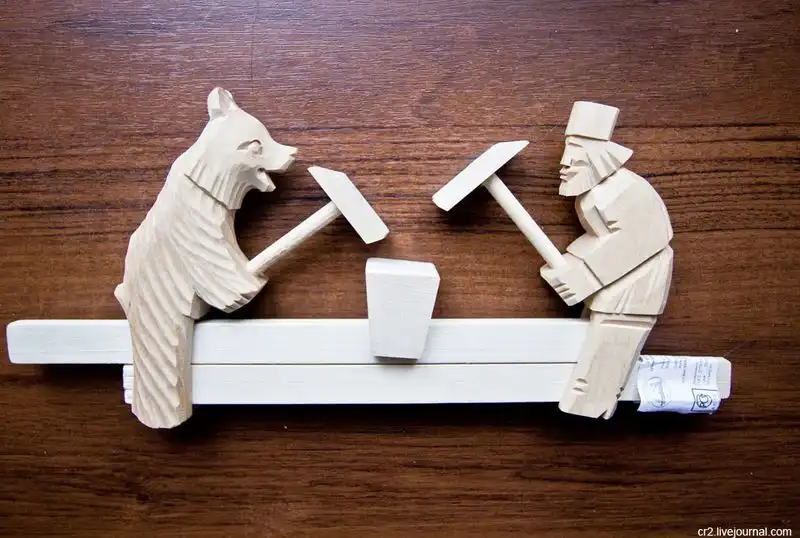 Неокрашенная игрушка часто изображает быт крестьянина, «помогают» которому звери. Впрочем, сюжетов много, и чем будут заниматься герои, зависит от фантазии мастера. Есть тоже подвижные, как эта — самая известная — «Кузнецы»: