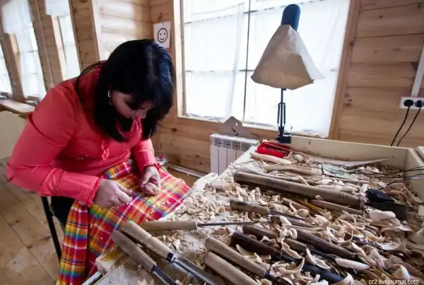 Потом обрабатывают инструментами — стамесками и специальными очень острыми богородскими ножами. Да, ножи тоже были местные. Когда-то пока одна часть села делала игрушки, вторая — готовила ножи и стамески для их изготовления. Сейчас мастера пользуются привозным инструментом или делают его сами, осталось только название