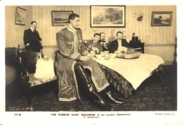 В них, в частности, писалось, что вес великана достигает 182 кг, а рост слегка уменьшается в будние дни, но увеличивается после воскресного отдыха. Впечатляли читателя и антропологические подробности Махнова: уши были 15 см в длину, а губы - 10 см в ширину, длина ступни и ладони равнялись 51 см и 32 см соответственно.