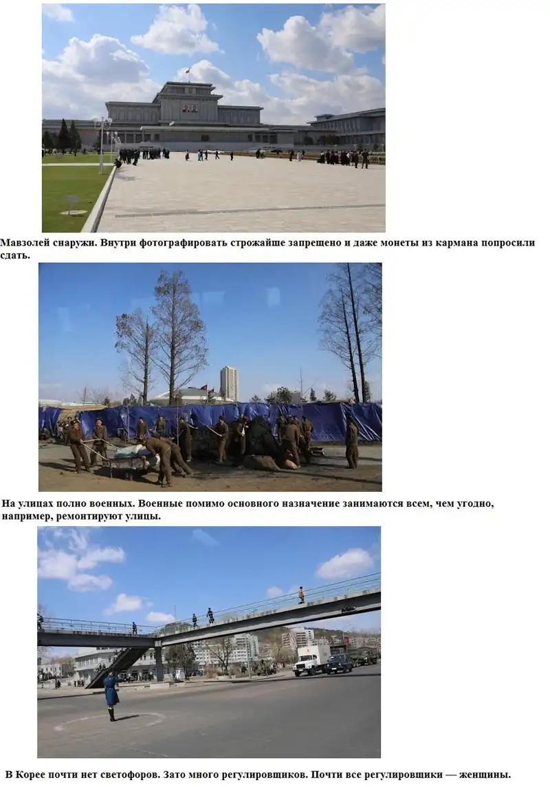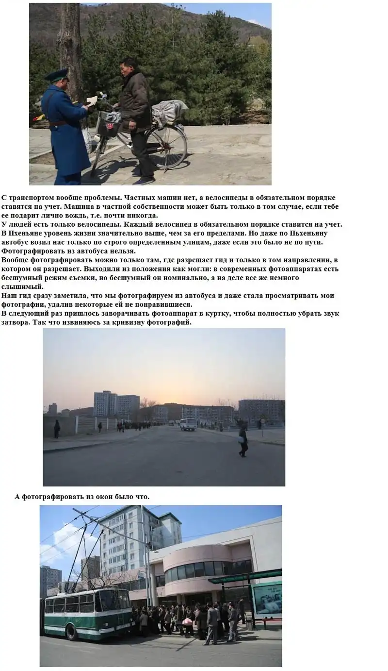 Сдается мне, что этот "турист" многое придумал. Возможно для того чтобы как всегда представить Северную Корею как "империю зла". открываем гугль мапс и видим на фотках Пхеньяна, что там построены довольно хорошие дороги, развязки и по улицам ездит довольно много легковушек. много трамваев и троллейбусов. И люди ходят в одежде разных цветов а не в однообразных сереньких костюмчиках. А велосипедистов не видать. Видно много современных небоскребов как и в капиталистических странах. И нигде не видно ни статуй ни портретов вождя. и на фотках морей нет забора с колючкой.