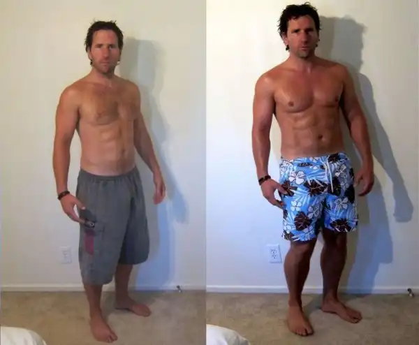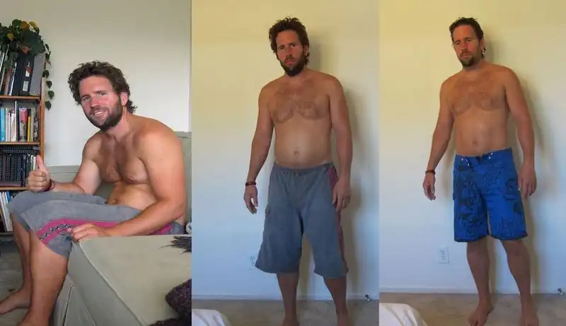 Эндрю работал 11 лет тренером по фитнесу. В это период жизни он немного набрал вес в 84 кг. и решил сделать эти фото. На первое фото он одел мешковатые шорты, специально не брился, ну и вывалил пузо проще говоря. На фото справа, он специально одел более узкие шорты, правильно расставил свети сделал пару отжиманий и вуаля.
