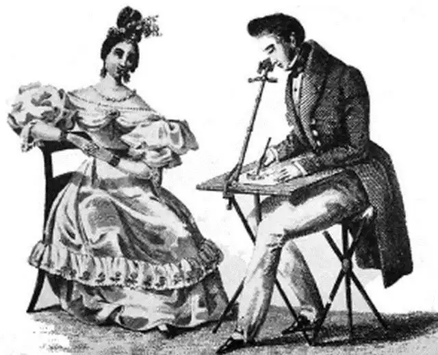 Интересные дела, говорит Хокни. Судя по всему, Энгр использовал Camera Lucida — устройство, которое представляет собой конструкцию с призмой, которая крепится на стойке к планшету таким образом, что художник, глядя на свой рисунок, видит одним глазом реальное изображение, а другим — собственно рисунок и свою руку. Получающаяся оптическая иллюзия позволяет точно переносить пропорции реального изображения на бумагу. Что и есть «залог» реалистичности изображения.
