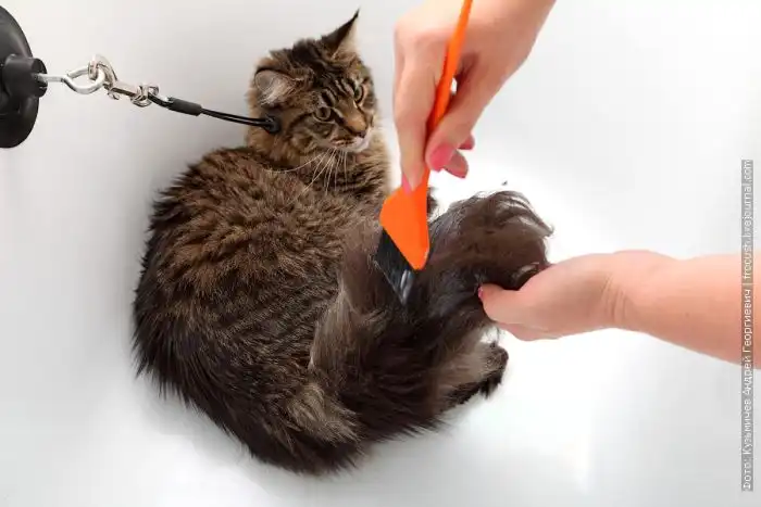 Шаг 2. Перед купанием необходимо вычесать животное, разобрать колтуны при их наличии.