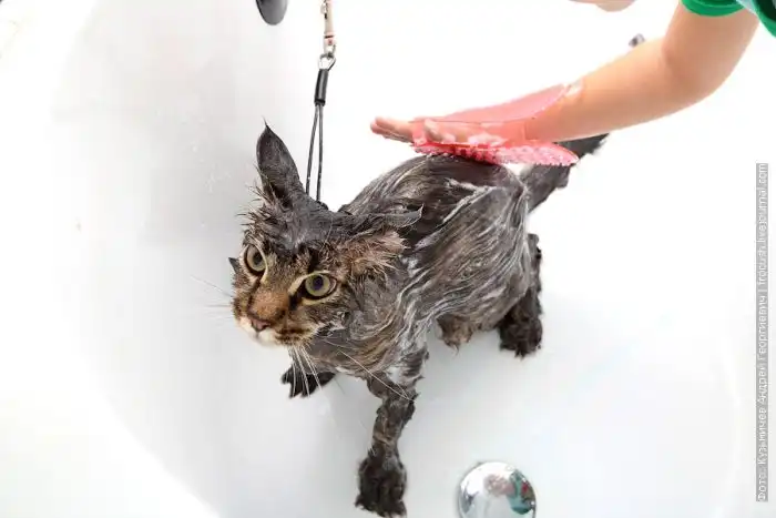 Для лучшего проникновения шампуня в шерсть используем массажную варежку. Гладим кошку по шерсти.