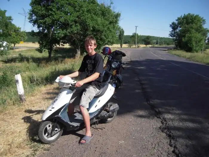 Я остановился передохнуть, когда этот парнишка подъехал на скутере. Тоже без бензина! Он был счастлив, когда я предложил ему помощь, но сказал, что ему нужен только хороший бензин, девяносто-пятый! Он не хотел заливать дешёвый бензин в свою табуретку.