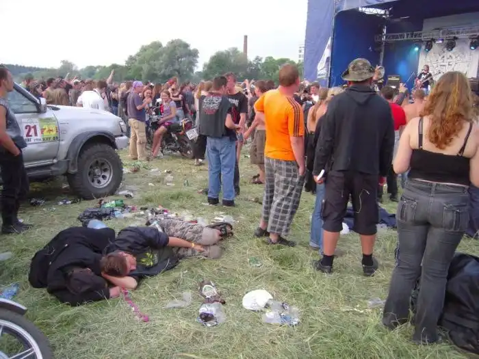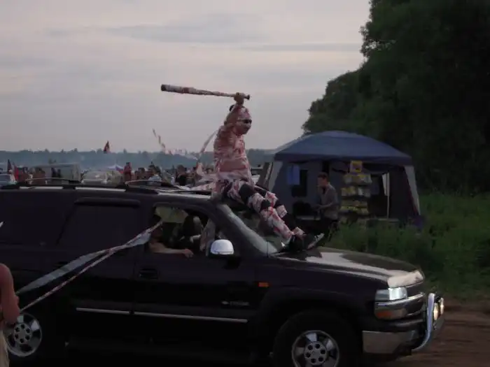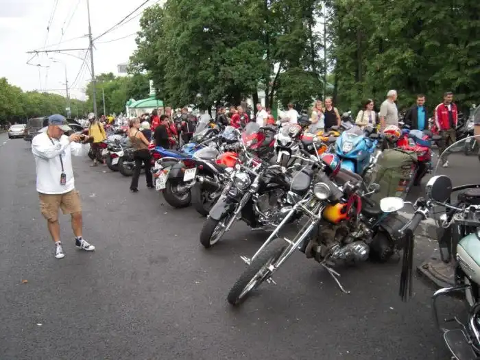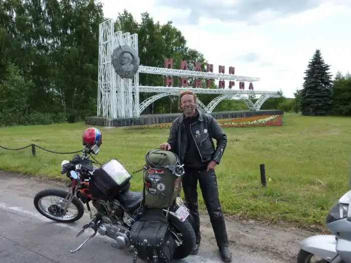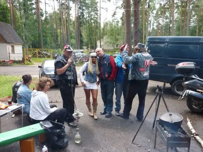 Когда я был недалеко от Владимира, мне встретились русские байкеры на дороге. Они спросили, не собираюсь ли я на тусовку, и я снова, как и раньше в Малоярославце, не сдрейфил: „Конечно собираюсь!- хотя услышал о вечеринке только что. Я последовал за ними. Мы немного заблудились, попали на грунтовку, потом выехали на асфальт, там тоже заблудились. И, наконец, добрались до сходки. Это была небольшая вечеринка, всего пара сотен человек, но мне такое по нраву: можно познакомиться со всеми. Вход был платный — 500 рублей, и за эту сумму можно было есть сколько угодно весь уик-энд! Отличное предложение, я считаю!