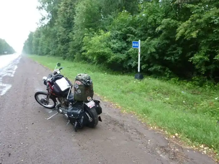 Пытался добраться до Казани, но дождь заставил сойти с трассы раньше. Мне было холодно и мокро. Около шести вечера я остановился в придорожном кафе выпить кофе. Там я снова встретил мотоциклистов (ого, с австралийскими номерами!). Мы разговорились, а потом было поздно куда-то ехать, и я снял комнату здесь же, у дороги.