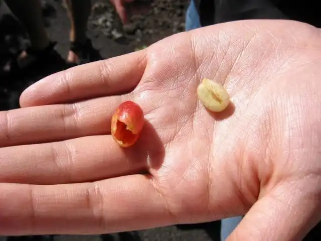 Зелёный кофе — это семечка кофейной ягоды, извлечённая из многочисленных органических пелёнок: кожуры, мякоти, пергамента. Представьте себе сливу, у которой совсем мало мякоти, и она очень крепко прикреплена к семечке.
