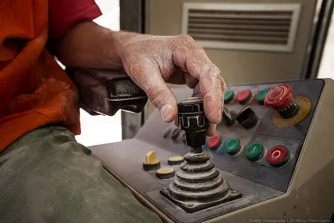 — Она очень хорошо ходит, хорошо разворачивается. Шаг в два с половиной метра занимает всего полторы минуты. Вот, под рукой, пульт управления шагами: лыжи, база, стоп, поворот экскаватора. Через неделю мы готовимся поменять место дислокации, в обратную сторону пойдем, туда, где конвейер строится.