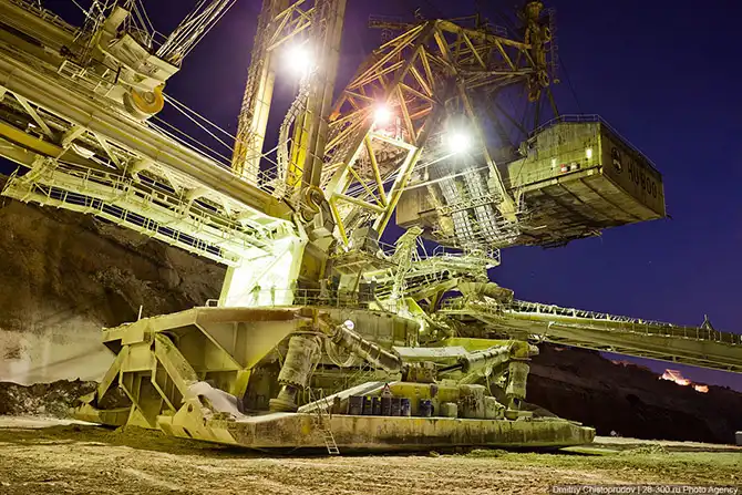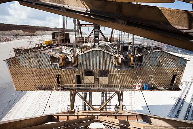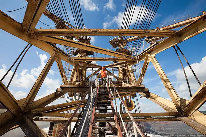 Только на верхней площадке экскаватора, в сорока метрах от земли, ощущаешь его истинные размеры . Кажется, что в лестничных галереях можно заблудиться, а ведь в этих хитросплетениях металла и кабельных коммуникаций есть еще рабочие и машинные отделения, зал с электрооборудованием, распредустройства, отсеки гидравлических агрегатов шагания, поворота, устройства подъёма и выдвижения роторной стрелы, грузоподъемные краны, конвейеры.