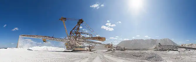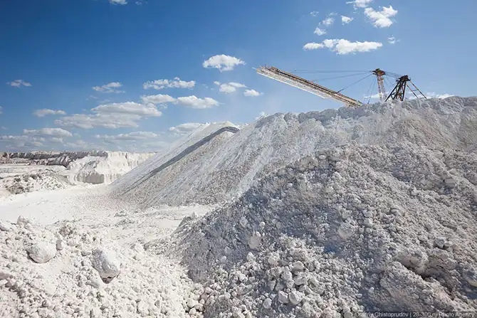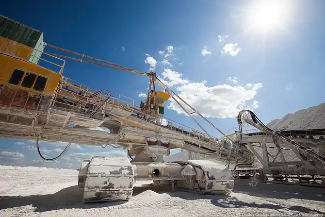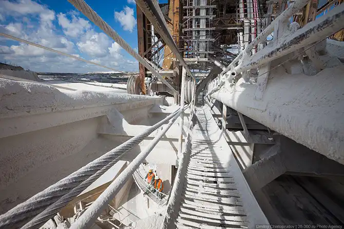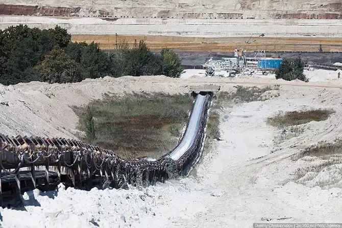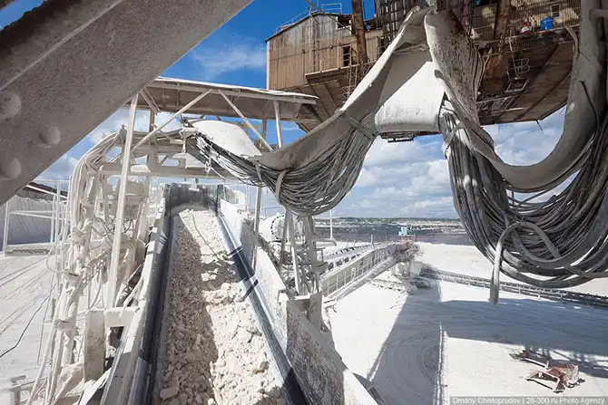 Мел и глина передаются по конвейеру на отвалообразователь.