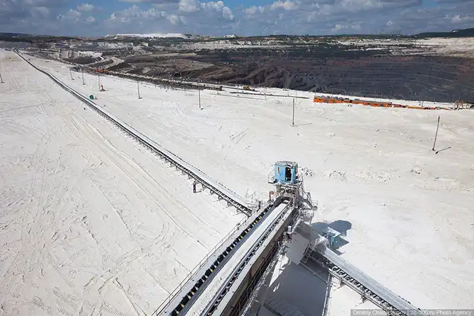 С погрузочной стрелы порода уходит по 7-километровому конвейеру на другую сторону разреза.