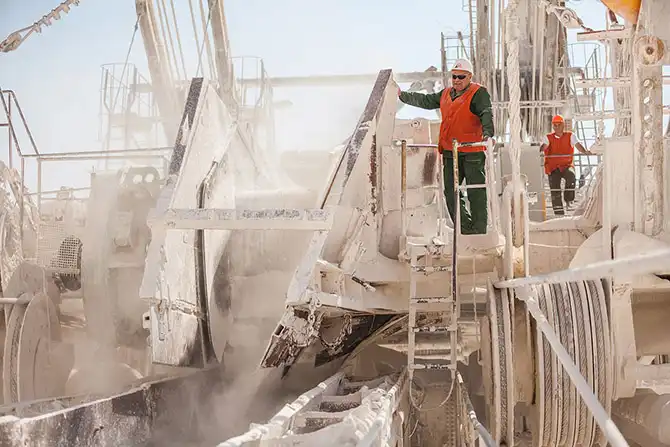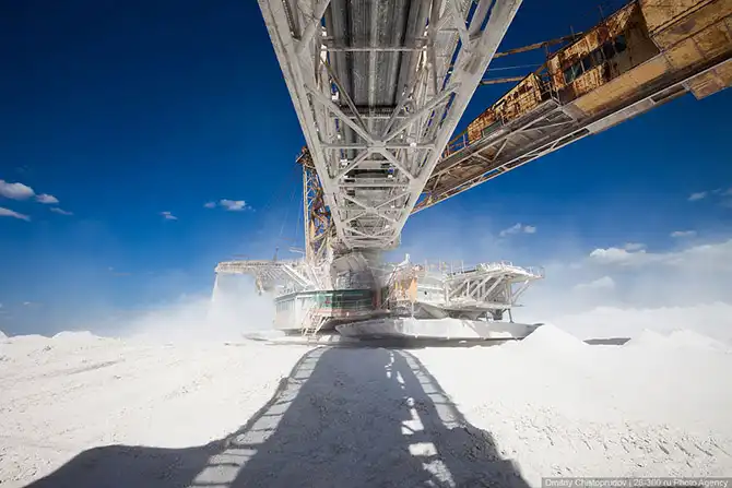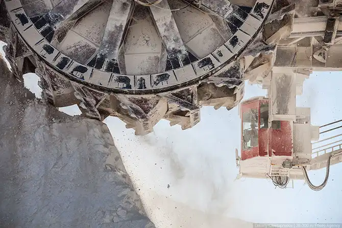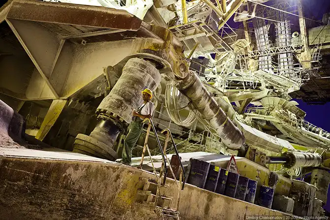 Задача экскаватора — снимать рыхлые отложения над скальной породой месторождения. Дальше мел или глина, срезаемые роторным колесом, передаются по конвейеру. Около двадцати минут порода движется по резиновым лентам, проходя за это время путь более семи километров с одного края разреза на другой, пока не окажется выброшенной отвалообразователем. Отвалообразователь — махина, сравнимая по размерам с роторным экскаватором.
