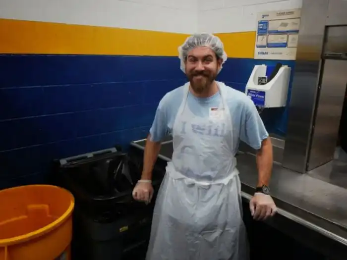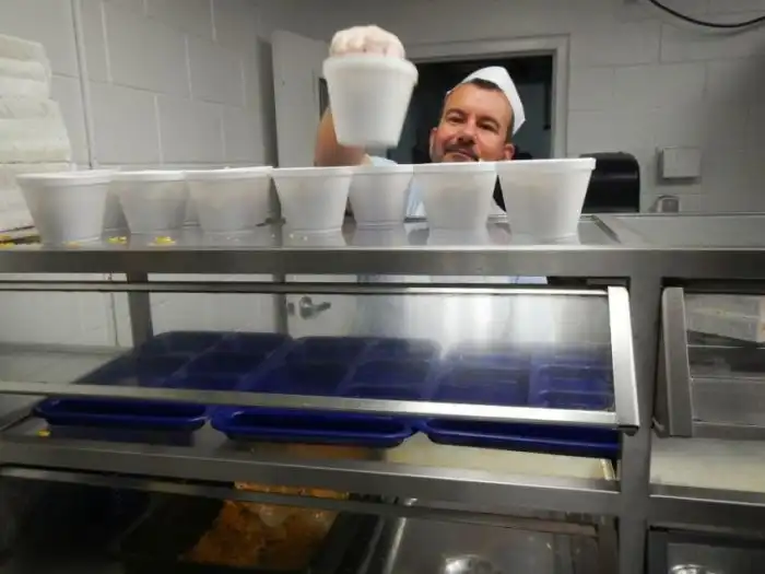 Нас разделили на несколько команд - на раздачу еды, на уборку и мойку посуды, и на приготовление обеда. Линия раздачи начиналась с кукуруных хлопьев. Несколько сортов молока они уже наливали по вкусу.