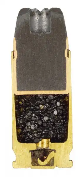 Специальный патрон 7,62/5,6 мм Salvo Squeezebore с тремя латунными пулями. Предназначен для особого оружия: задняя часть ствола у него нарезная цилиндрическая, а передняя — коническая, гладкая. В нарезной части все три пули движутся под действием пороховых газов как единое целое, но в коническом его участке пули обжимаются, задние при этом вытесняются из передних и из ствола вылетают уже порознь. Из-за обжатия пуль калибр указывается через дробь, поскольку вначале пуля имеет калибр 7,62 мм, а в процессе движения по каналу ствола он уменьшается до 5,6 мм. И вот такие трансформеры придумали еще в 1970-е годы!