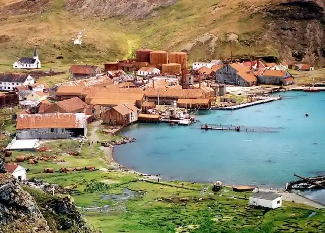Грютвикен был построен как китобойня рыболовецкой компании Капитана Карла Ларсена в 1904 году. В декабре 1966 он был закрыт для посторонних, но церковь на территории всё ещё иногда используется для заключения браков. У жителей был свой собственный кинотеатр (фото внизу, 1933 год), но пару лет назад он был разрушен.