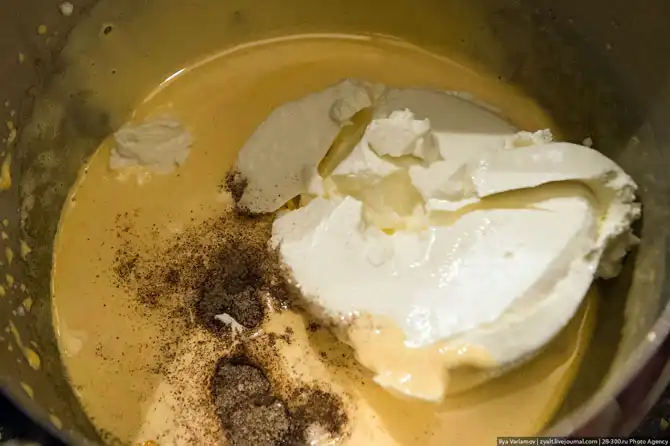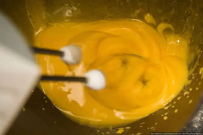 Их взбиваем пока они не станут бледно-желтыми. В желтки добавляем 1 пакетик ванильного сахара. Заливаем туда коньяк, и вываливаем сыр! Теперь надо все это дело перемешать аккуратно ложкой, пока не получится однородная масса.