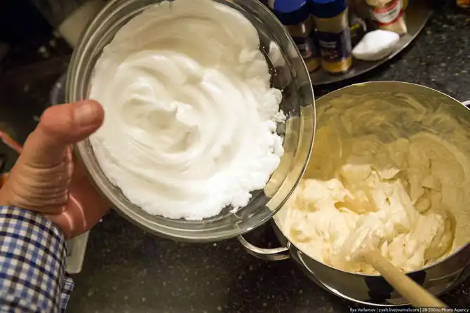 Теперь в эту однородную массу вываливаем взбитые белки и опять все аккуратно перемешиваем.